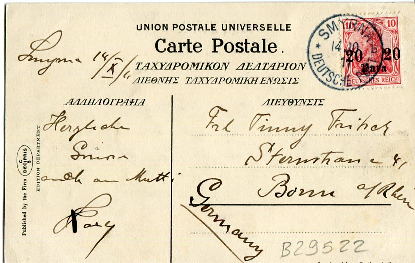 Turkey German Levant Smyrna 1911 to Bonn ed Decipris