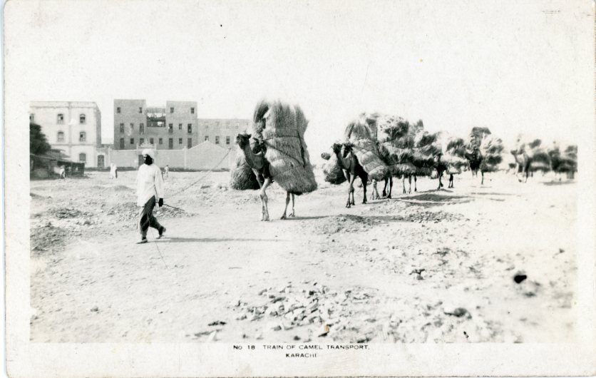 Pakistan: Unused photo postcard titled ‘Train of Camel Transport Karachi’