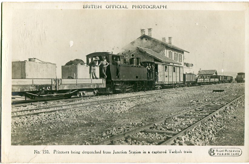Palestine: Unused postcard titled ‘Prisoners being dispatched from Junction Station in a captured Turkish train‘.
