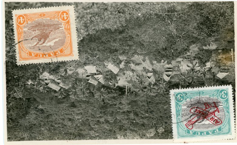 Papua New Guinea: 1930 postally unused photo postcard of aerial view of the native village franked with Papua airmail stamp.