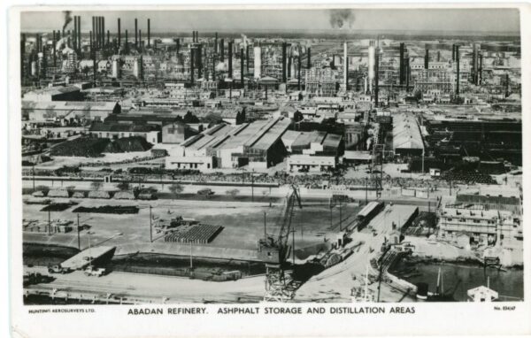 Iran: 1950 photo postcard titled ‘Abadan Refinery. Asphalt Storage and Distillation Areas’ to Buxton franked with 5r tied by Abadan datestamp.