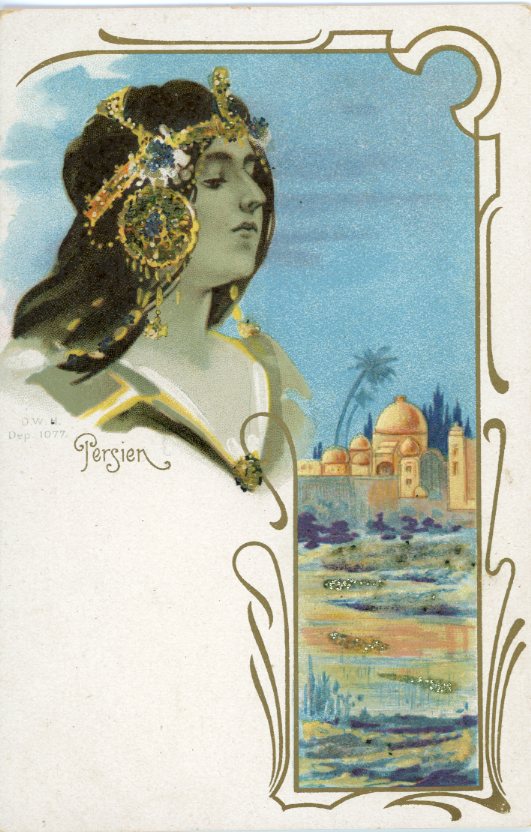 Iran: Unused glitter Art Nouveau postcard of Persian Woman.