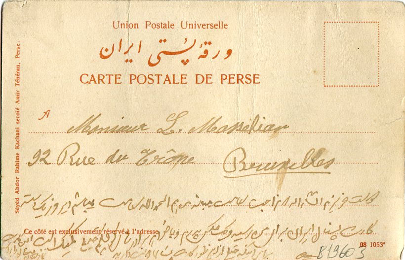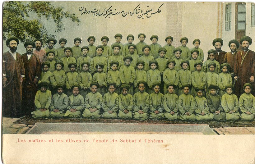 Iran: Unused postcard titled ‘Les maitres et les eleves de l’ecole de Sabbat a Teheran’ addressed to Belgium but not posted. ed. Seyed Abdor Rahime Kachani