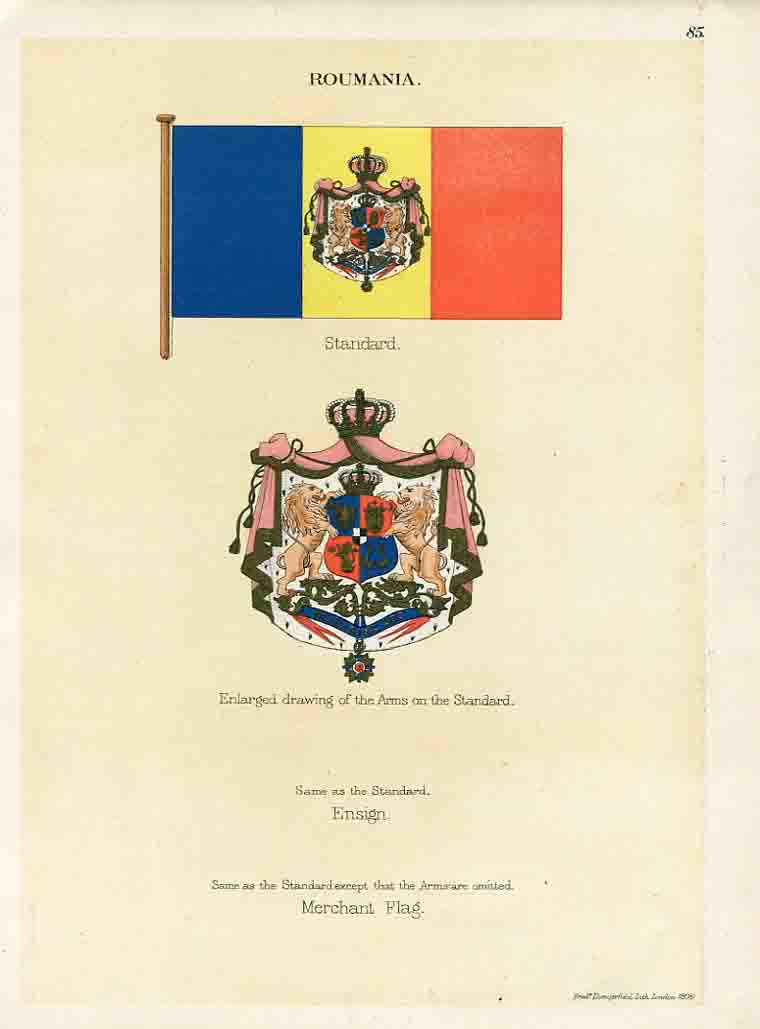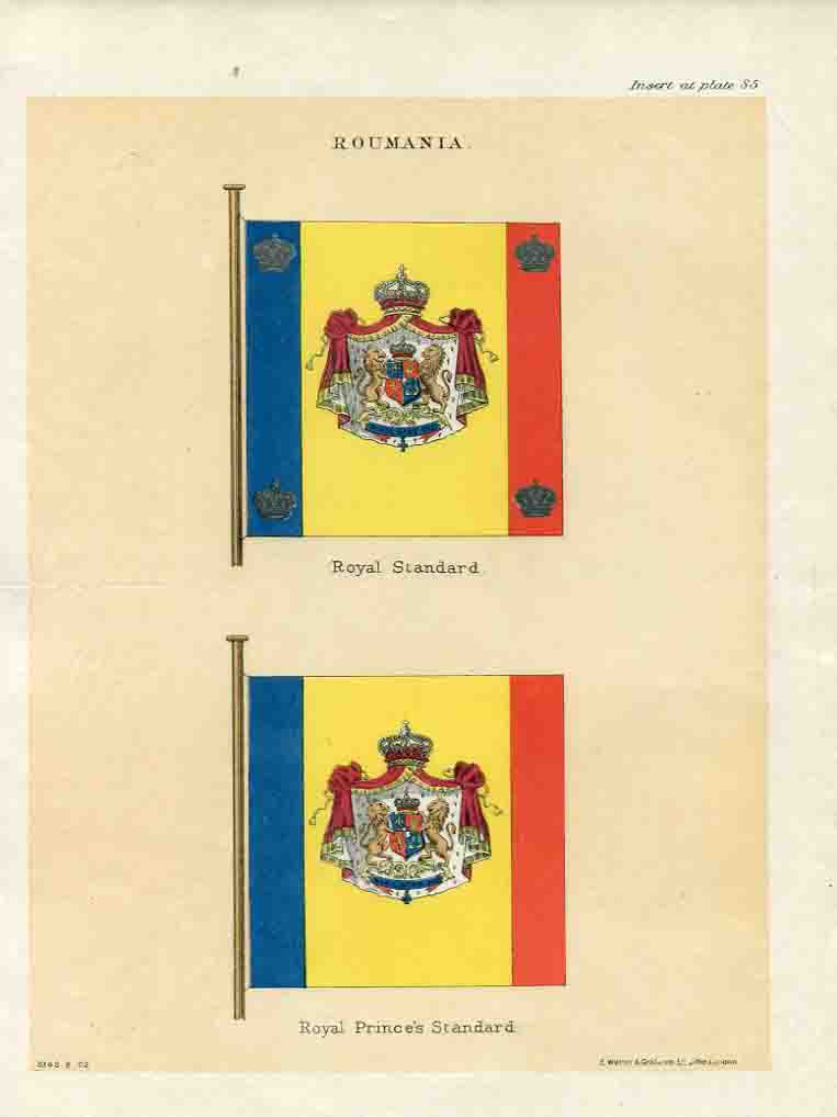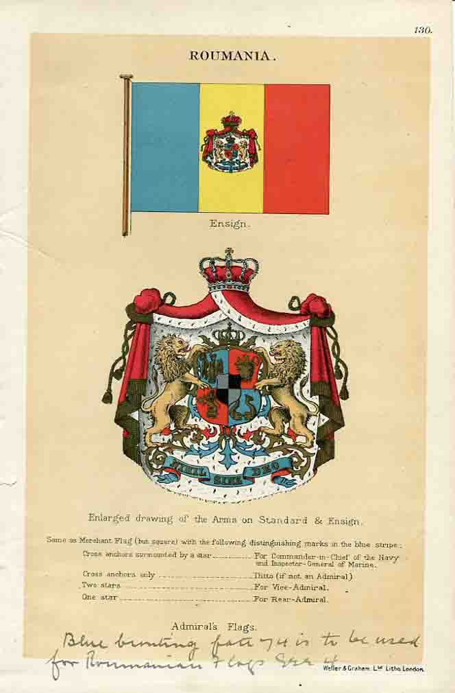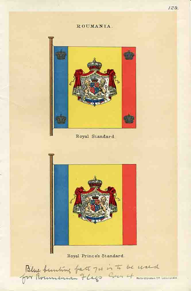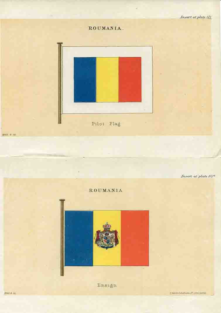 Romania: Royal Ensign and Pilot Flags lithographed by Frederick Dangerfield. London (est.1896) and Weller & Graham Ltd in four approx. A4 size pages, one thin paper and two half pages on thin paper.