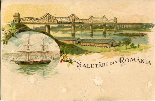 Romania: Unused lithograph postcard depicting ship and bridge.