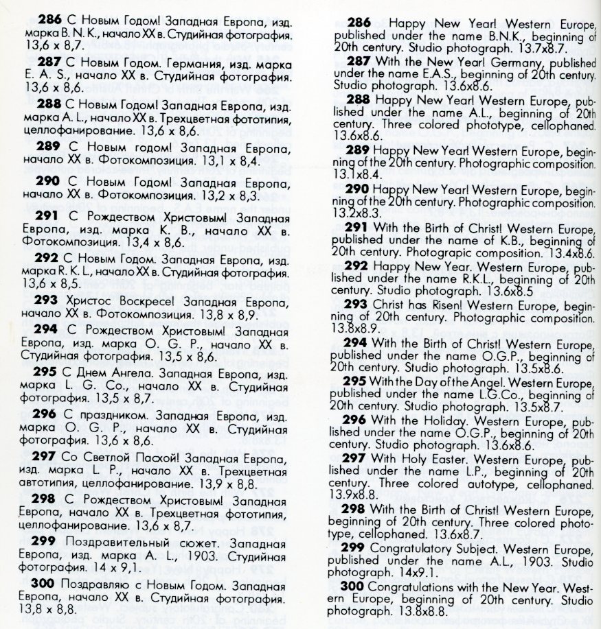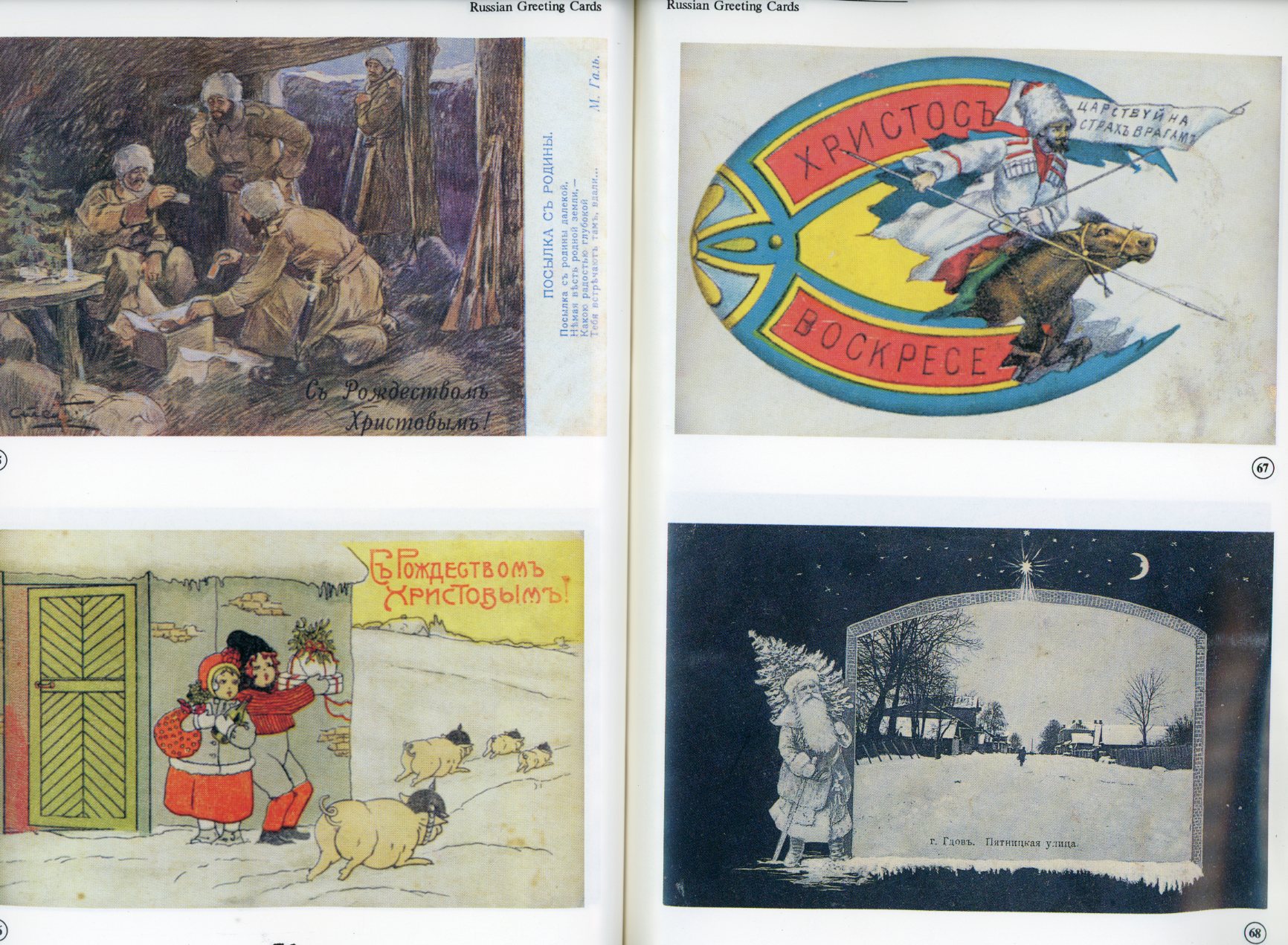 Russia: The Greeting Card in Russia (End of the XIX century – beginning of the XX century) compiled by Yuri Kombolin, 1994, hard cover, 192 pages, richly illustrated, English and Russian text. 175 x 245 mm.