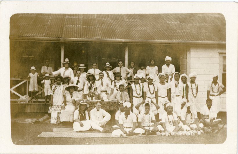 Samoa: Unused photo postcard of native people and westerners in front of the house.