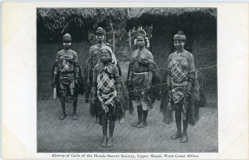 Sierra Leone: Unused postcard titled ‘Group of Girls of the Bundu Secret Society, Upper Mendi’.