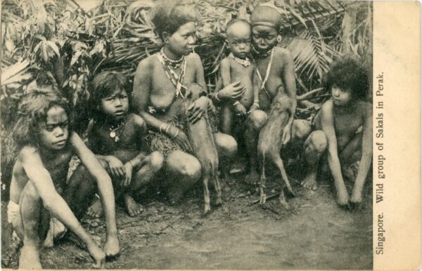 Unused photo postcard titled ‘Wild group of Sakals in Perak’.