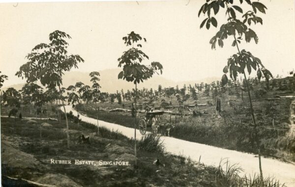 Unused photo postcard titled ‘Rubber Estate and Bull Cart’.
