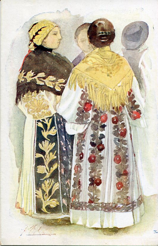 Croatia: Unused watercolour costume postcard ‘En conversation (Babinagreda)’.