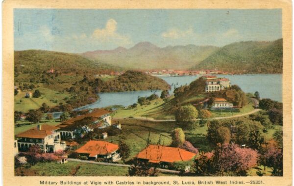 St. Lucia: 1945 postcard to United States titled Military Building at Vigie with Castries in background’.
