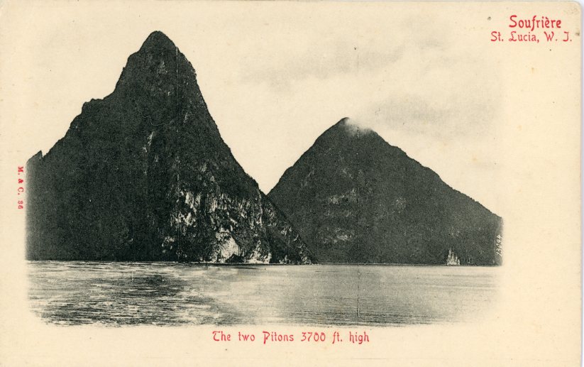 St. Lucia: Unused postcard titled ‘Soufriere. The two Pitons 3700 ft. high’. ed. M & C