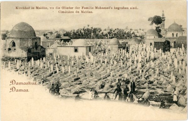 Syria: Unused postcard titled ‘Kirchhof in Maidan, wo die Glieder der Familie Mohamed’s begraben sind. Cimetiere du Meidan’.