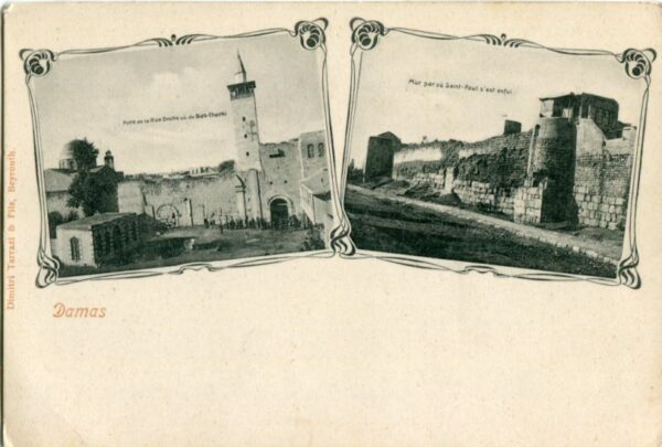 Syria: Unused postcard of Damascus with Bab Charki (East Gate) and St Paul Ruins views. ed. Dimitri Tarrazi