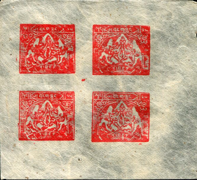 Tibet: Wireless Telegraph issue red unused imperforate sheetlet of 4. (*). SOLD AS FORGERY