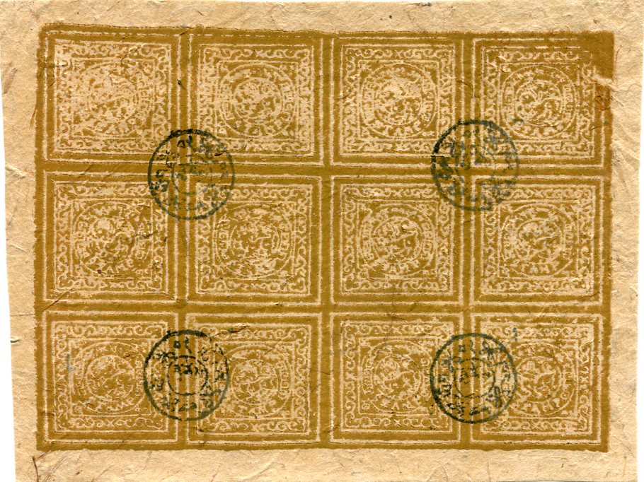 Tibet: Inscribed “STAMP” non postal imperforate sheetlet of 12 struck by four cancels.