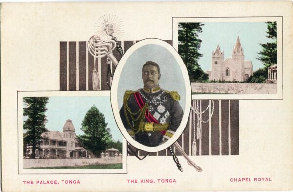 Unused multi view postcard of Tonga Palace, Royal Chapel and The King