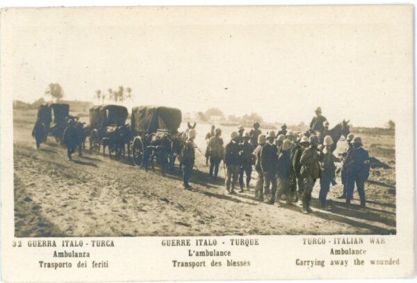Italy – Türkiye: 1917 postcard titled Turco – Italian War Ambulance Carrying away the wounded’ used from Torino to Zurich