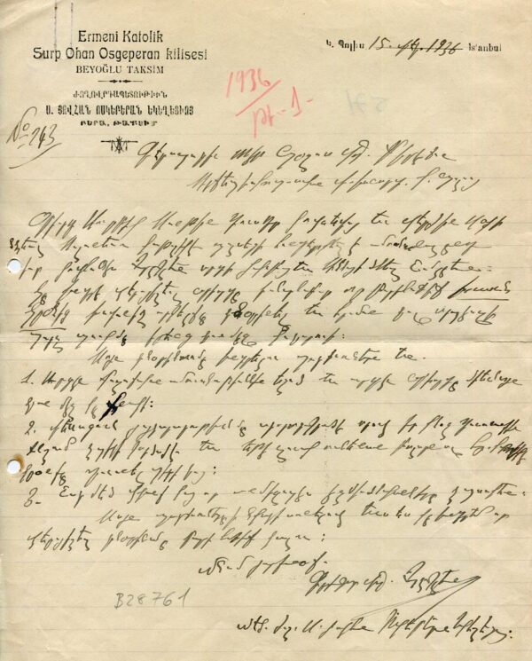 Türkiye: 1936 document from Surp Ohan Osgeperan Armenian Catholic Church in Taksim, Istanbul