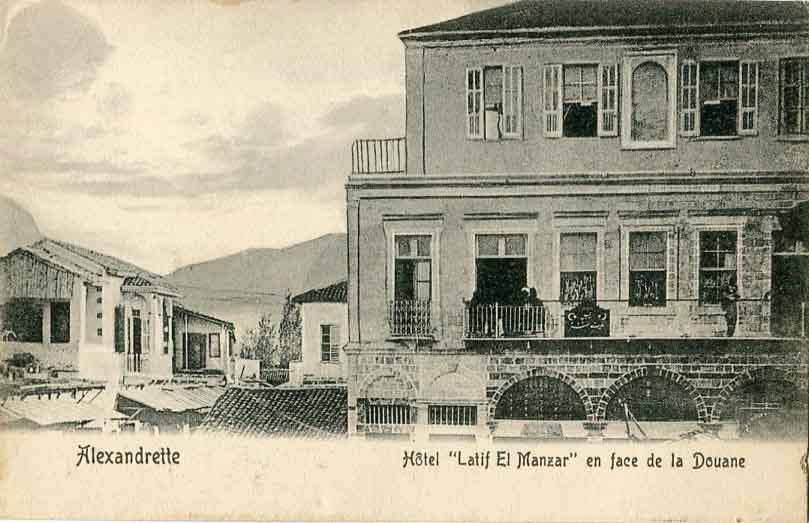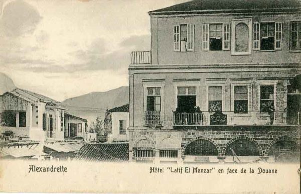 Turkey – Hatay: Unused postcard titled ‘Alexandrette. Hotel “Latif El Manzar” en face de la Douane’. Scarce Armenian editorH. Abadjian.
