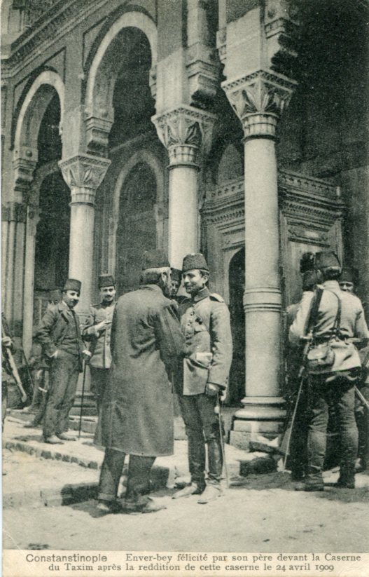 Turkey: Unused postcard titled ‘Enver bey felicite par son pere devant la Caserne du Taxim apres la reddition de cette caserne le 24 Avril 1909. ed. Bon Marche #295