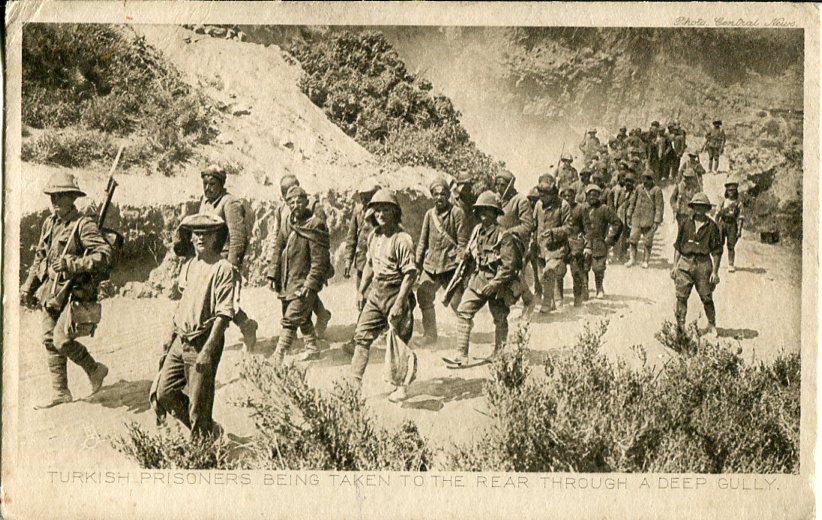 Türkiye: Unused photocard titled ‘Turkish Prisoners being taken to the rear through a deep gully’. ed. The Dardanelles Operations series I by Tuck