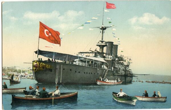 Unused postcard titled ‘L’arrivee a bord de Messoudie de S. M. Le Sultan’