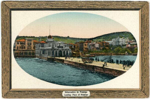Türkiye: Unused picture frame postcard titled ‘Landing – Place of Prinkipo’. ed. J.M.F #1340/41