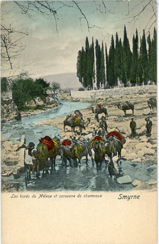 Turkey: Unused postcard titled ‘Smyrne. Les bords du Meleze et caravane de chameaux’.
