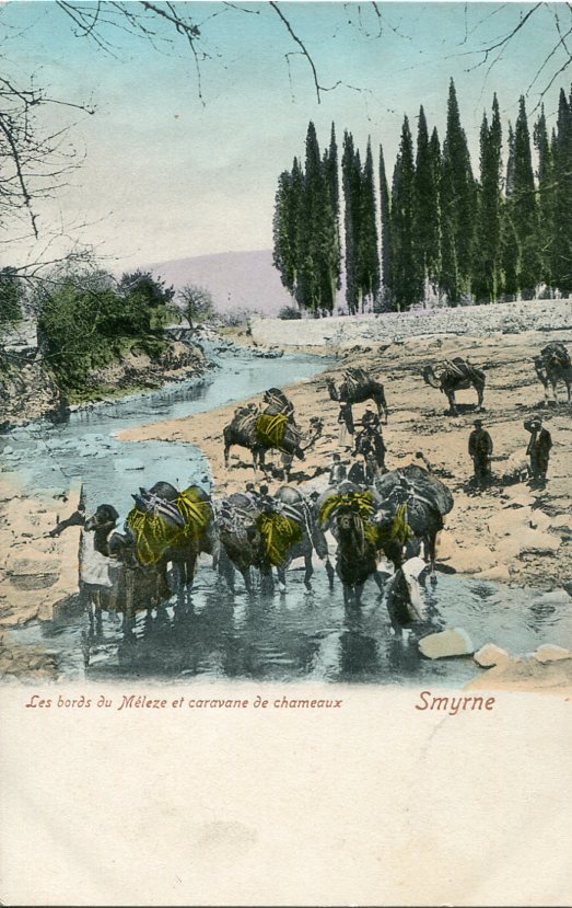 Türkiye: Unused postcard ‘Smyrne. Les bords du Meleze et caravane de chameaux’.