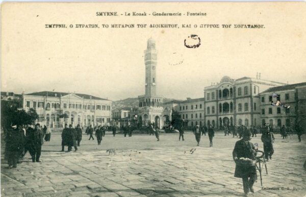 Türkiye: Unused postcard titled ‘Smyrne – Le Konak – Gendarmeire – Fontaine’.