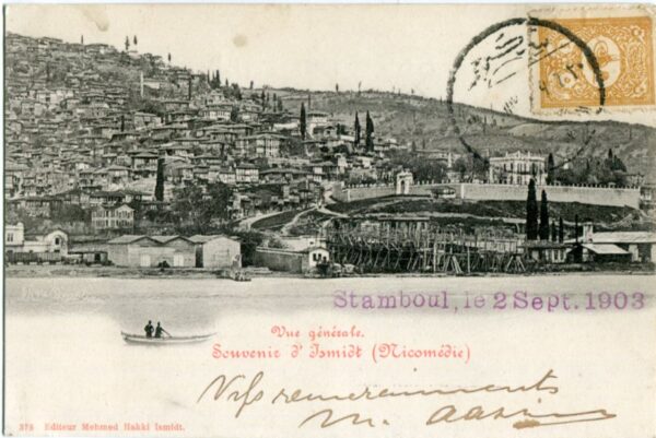 Ottoman Turkey: 1903 (2 September). Postcard titled ‘ Ismidt (Nicomedia)’ to Mayenne, France franked with 5pa foreign use of 1901 stamp tied by Istanbul datestamps. Reverse M. Aassim merchant cachet. ed. Mehmed Hakki #378.