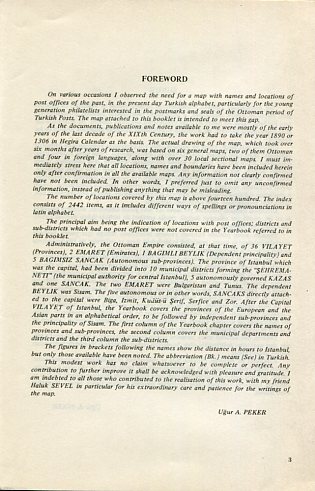 Türkiye: The Administrative Division and The Post Offices in the Ottoman Empire by Ugur A. Peker, softbound with folded A1 size map of the Empire, 56 pages including A to Z list of the post offices, vilayets, sandjaks etc., as new condition, published 1984, bilingual Turkish and English.