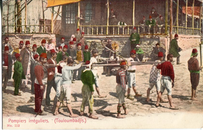 Turkey: Unused postcard titled ‘Pompiers irreguliers. (Touloumbadjis)’.