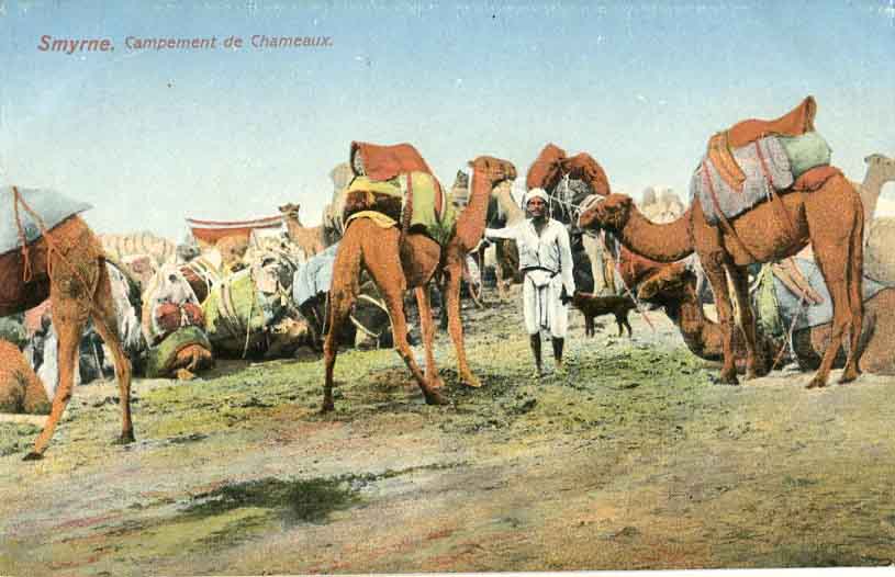Turkey: Unused postcard titled ‘Smyrna. Campement de Chameaux’.