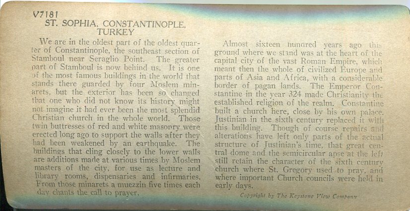 Turkey: Keystone View Company stereoview titled ‘St. Sophia, once Christian Cathedral of Byzantium, now Mohammedan Mosque, Constantinople’. #V7181T. please note some part of the image is blurred because of the scan, otherwise all very fine.