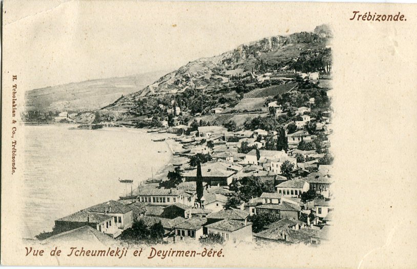 Türkiye: Unused postcard titled ‘Vue de Tcheumlekji et Deyirmen-dere, Trebisonde. ed. H. Tcholakian