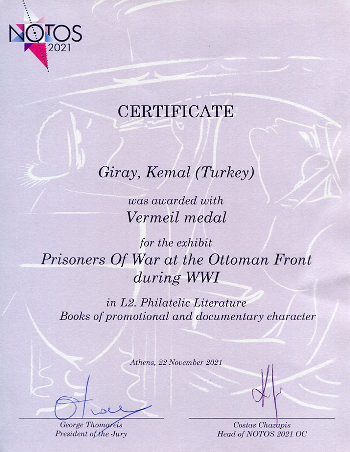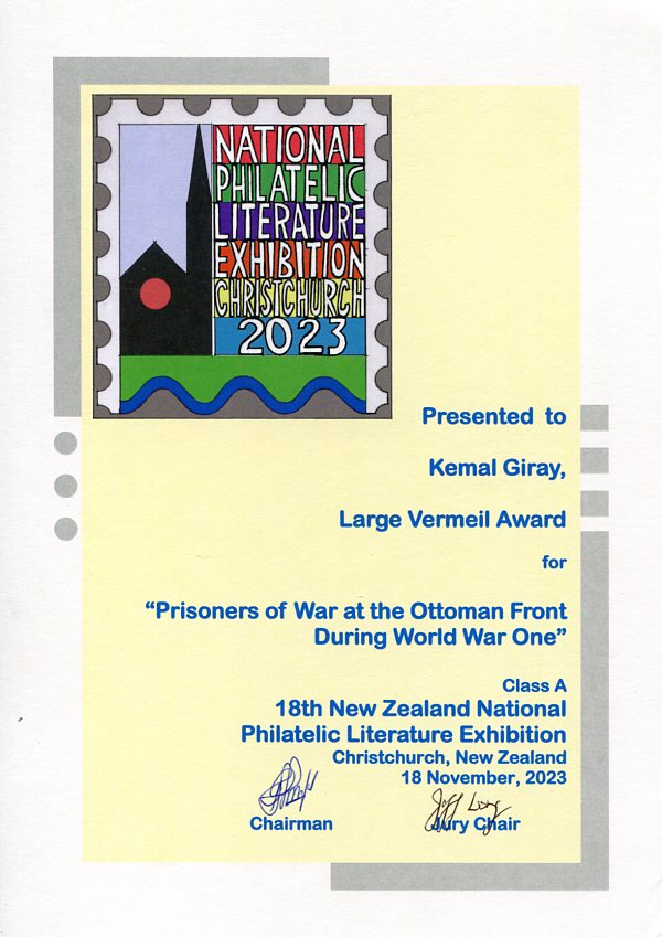 Prisoners of War at the Ottoman Front during WWI. Ottoman Prisoners of War & Prisoners of War in Turkey. A Postal History and Ephemera Perspective by Kemal Giray, published 2021, full colour, 246 A4 pages, hardbound, limited to numbered 150 copies. Received vermeil in Notos 2021 FEPA international philatelic exhibition