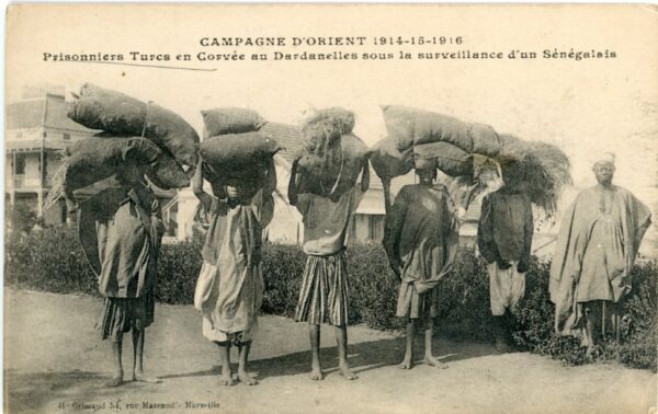 Türkiye: 1916 postcard titled ‘Prisonniers Turcs en Corvee au Dardanelles sous la surveillance d’un Senegalais’.
