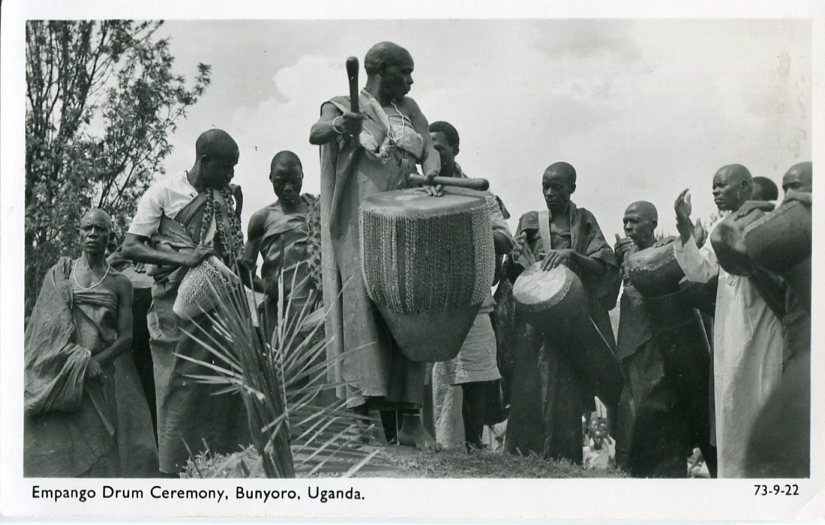 Unused photo postcard titled ‘Empango Drum Ceremony, Bunyoro, Uganda’.