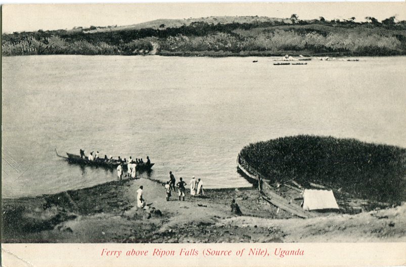 Unused postcard titled ‘Ferry above Ripon Falls (Source of Nile), Uganda’.