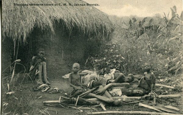 Unused postcard titled ‘Sleeping sickness cases at C.M.S., Iganga Busoga’.