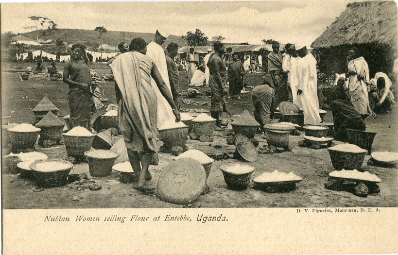 Uganda: Unused early postcard titled ‘Nubian Women selling Flour at Entebbe, Uganda’. ed. D.V. Figueira