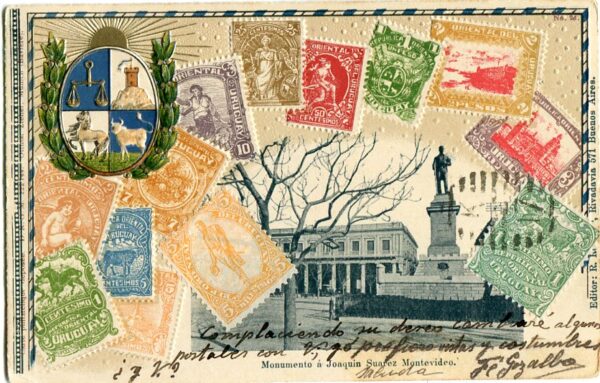 Uruguay: 1906 embossed stamps and Joaquin Suarez monument photo postcard to Barcelona, Spain. ed R. Rosauer
