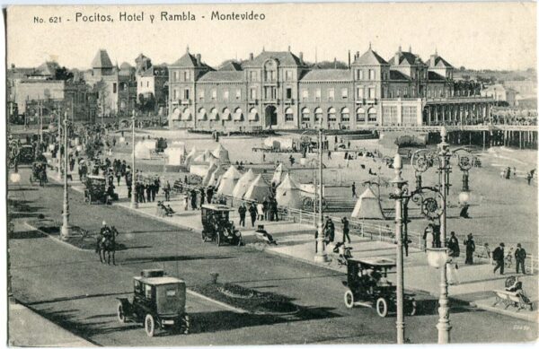 Uruguay: Photocard to Bradford, England titled ‘Pocitos, Hotel y Rambla’. ed. A. Carluccio