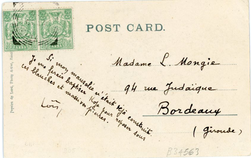 Zanzibar Koja Cemetery 1905 to Bordeaux ed Pereira Lord