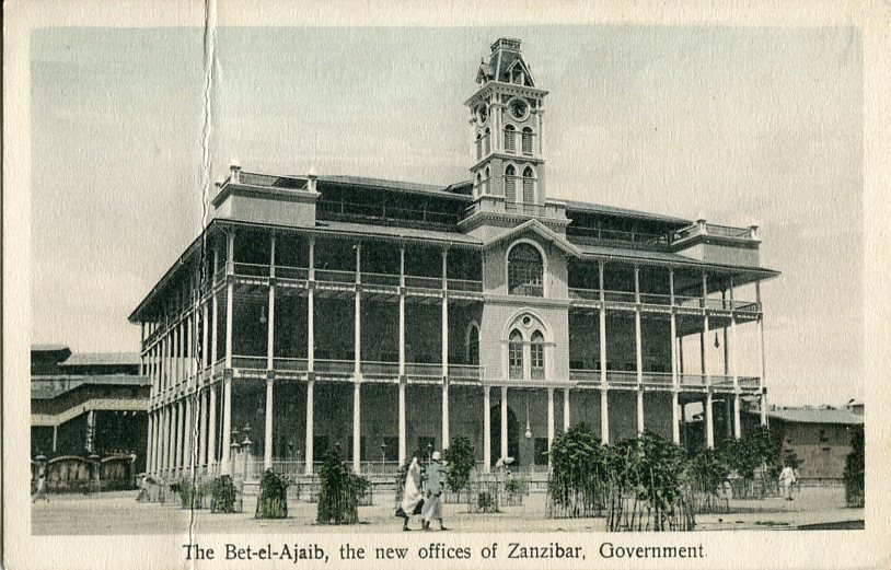 Zanzibar: Unused postcard titled ‘ The Bet-el-Ajaib, the new offices of Zanzibar, Government’. Heavily creased on left. ed. A.C. Gomes & Son